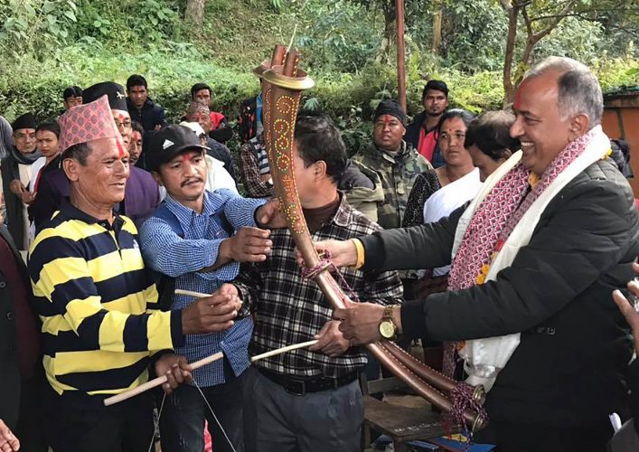 तनहुँ । जिल्लाको भानु नगरपालिका–६ स्थित सिम्पानी नेवा समाजलाई पञ्चेवाजाा हस्तान्तरण गर्दै नेपाली काङ्ग्रेसका केन्द्रीय सदस्य शङ्कर भण्डारी । तस्वीर: कृष्ण न्यौपाने, दमौली, तनहुँ रासस