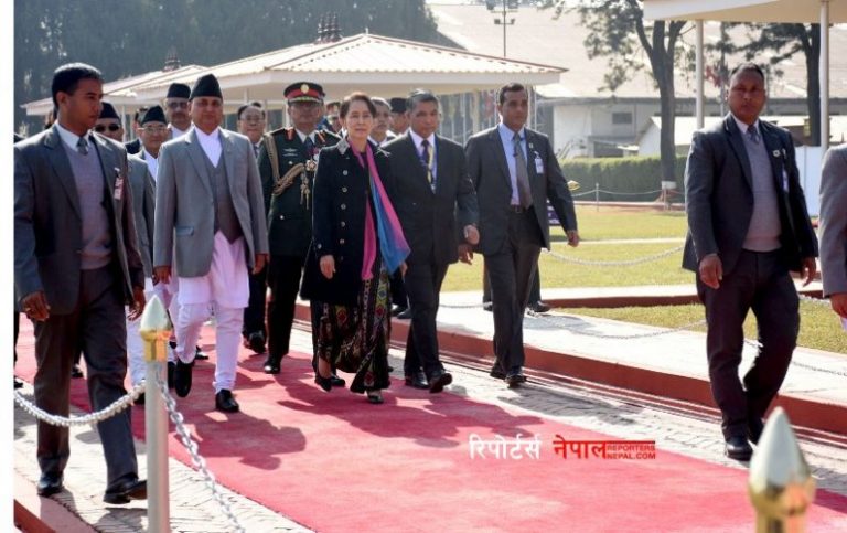 काठमाडौँ,१३ मंसिर । एशिया प्रशान्त शिखर सम्मेलनमा भाग लिने सिलसिलामा प्रधानमन्त्री केपी शर्मा ओलीको निमन्त्रणामा नेपालको औपचारिक भ्रमणका लागि म्यान्माका स्टेट काउन्सिलर आङ सान सु की आजबिहान काठमाडौँ आइपुगेकि छन।