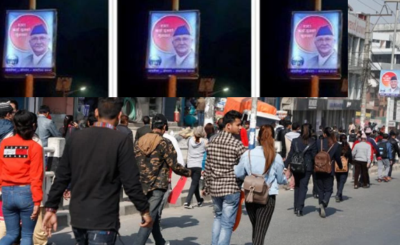राजधानी काठमाण्डौका सडक छेउका पोल पोलमा प्रधानमन्त्री केपी ओलीको तस्विरसहित लेखिएको थियो–एउटा नयाँ युगको सुरुवात ।