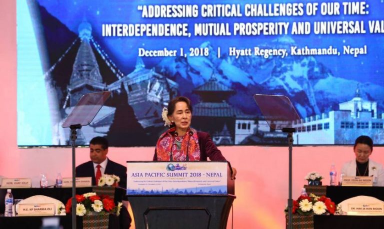 काठमाडौँ, १५ मङ्सिर। म्यान्माका स्टेट काउन्सिलर आङसान सु कीले विश्वमा दिगो विकास र शान्ति स्थापनाका लागि सहकार्यमा जोड दिनुभएको छ । आजदेखि यहाँ शुरु भएको ‘एशिया प्रशान्त शिखर सम्मेलन–२०१८’ लाई सम्बोधन गर्दै उहाँले हरेक चुनौतीलाई अवसरका रुपमा लिई सकारात्मक सोचका साथ त्यसको सामना गर्न सक्नुपर्ने बताउनुभएको हो ।
