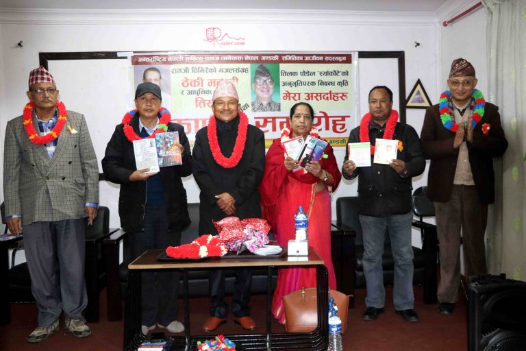 काठमाडौँ, २३ मंसिर । अन्तर्राष्ट्रिय नेपाली साहित्य समाज नेपाल गण्डकी समितिले संस्मरणात्मक निबन्ध सङ्ग्रह ‘मेरा असर्दाहरू’, गजल सङ्ग्रह ‘ठेकी मदानी’ र आधुनिक गीति एल्बम ‘तिर्सना’ बजारमा ल्याएको छ ।