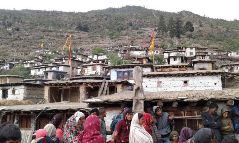डोल्पा–त्रिपुरासुन्दरी नगरपालिकाको सुँ गाउँमा एकतलाको घरमा घर जोडि बनाइएको परम्परागत घरहरु । तस्वीर हेमन्त केसी, जाजरकोट त्रिवेणी ,रासस