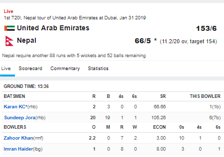 अहिले सन्दिप जोरा र करण केसी क्रिजमा छन् । आशा गरिएका व्याट्सम्यानले कमजोर प्रदर्शन गरेपछि नेपाल संकटमा परेको छ ।