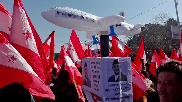 काठमाडौं, २१ माघ । प्रमुख प्रतिपक्षी दल नेपाली कांग्रेसले आज देशभरि विरोध प्रर्दशन गरेको छ । काठमाडौंमा कांग्रेसले विरोध प्रर्दशनमा वाईडबडी जहाज खरिद प्रकरणबारे प्रश्न उठाएको छ ।