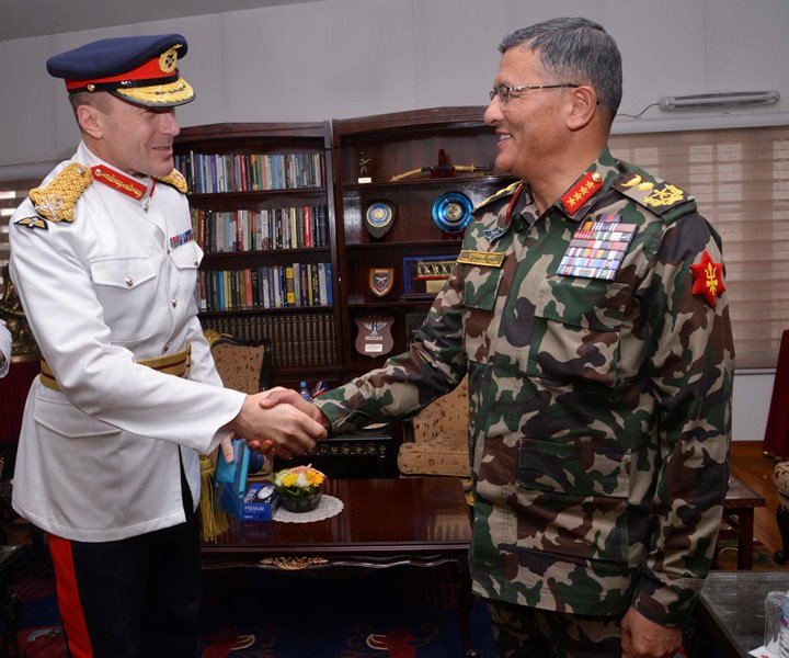 काठमाडौ, २३, माघ। बेलायतका सेना प्रमुख डुंक्यान क्याप्स सीबीईले प्रधानसेनापति महारथी पूर्णचन्द्र थापासँग भेट गरेका छन् । बेलायती सेना प्रमुख डुंक्यानले जंगी अड्डा पुगेर प्रधानसेनापति थापासँग शिष्टाचार भेटबार्ता गरेका हुन् ।
