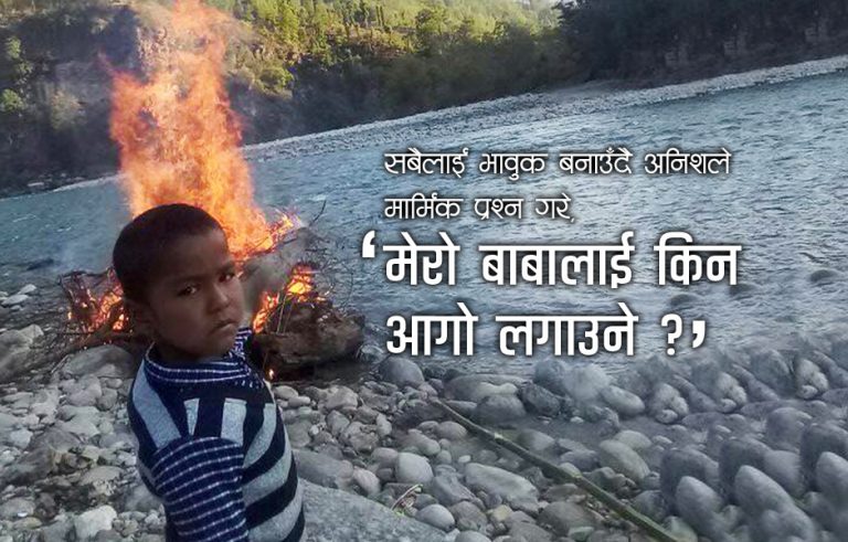 शवयात्रासँगै उनी पनि समसानघाट पुगे । तर के भइरहेको छ भन्ने कुराको कुनै भेउ पाएका थिनन् उनले । उनी त्यतिबेला आत्तिन्छन् जब बुबालाई चितामा सजाएर “आगो लगाउ” भन्दै उनको हातमा राँको दिइयो । त्यतिबेला उनले मार्मिक प्रश्न गरे “मेरो बाबालाई किन आगो लगाउने रु” उनी आगोले बाबाको शरीर पोल्छ भन्दै आगो लगाउन मानिरहेका थिएनन् ।