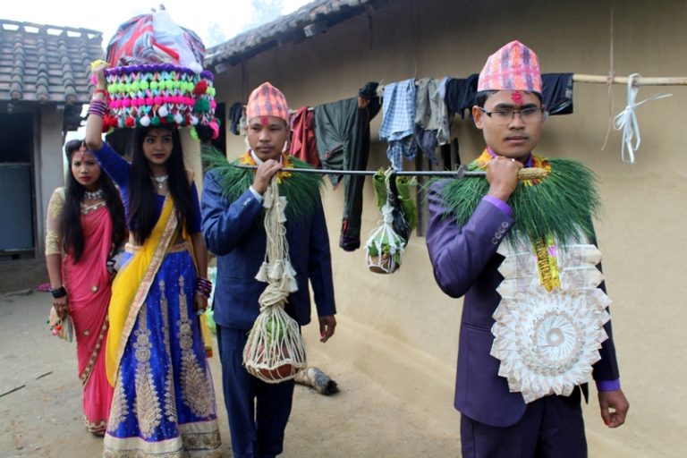 कञ्चनपुरको पिपलाडीका थारु समुदाय विवाहका अवसरमा बेहुला, बेहुलाका भिनाजु परम्परागत रुपमा बर्छिमा माछा, सालको पात, मदिरा बोकेर घर परिक्रमा गर्दै । यसरी सगुन बोकेर जानेलाई थारु भाषामा गञ्जवा भन्ने गरिन्छ । तस्वीर ः राजेन्द्रप्रसाद पनेरु, कञ्चनपुर
