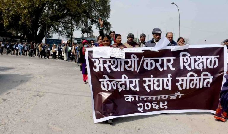 काठमाडौँ,२९ माघ । अस्थायी करार शिक्षक केन्द्रिय संधर्ष समितिले सरकारलाई दवाव दिन बिरोध प्रर्दशन गरेको गरेको छ । राजधानीको भद्रकालीबाट शूरु भएको प्रदर्शन माईतीघर,बबरमहल हुदै बानेश्वरमा पुगेर कोण सभामा परिणत भएको थियो ।राज्यले आफुलाई रोजगारको ग्यारेन्टी गर्नुपर्ने,औषधि उपचारको ब्यवस्था गर्नु पर्ने माग राख्दै उनिहरु प्रदर्शन उत्रिएका हुन । प्रर्दशनमा सव्र्वाेच्व अदालतको फैसलाको कार्वान्वयन गर,उमेरको हद म्याद हुन्जेल रोजगारको ग्यारेन्टी गर जस्ता नारा लगाएका थिए ।