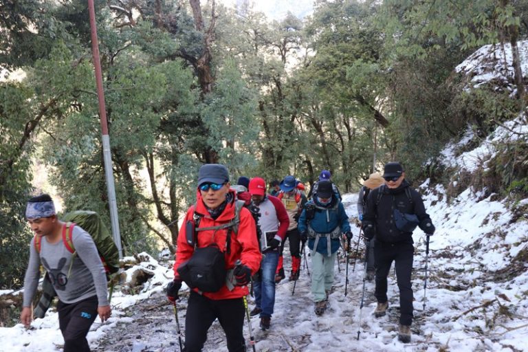 अन्नपुर्ण पदमार्गका क्रममा विदेशी पर्यटकहरु मनाङ चामे गाउँपालिका तिमाङको उकालो उक्लदै । तस्वीर नवीन लामिछाने मनाङ रासस