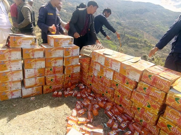 अछाम, १३ फागुन । मेल्लेख गाउँपालिकामा गाडी सहित स्थानिय महिला सञ्जाल र प्रहरीको सक्रियतामा ६७ पेटी कमसल मदिरा नष्ट गरिएको छ ।बरदादेबी सप्लायर्स जयगढबाट दुई जिपमा मेल्लेख लग्दै गरेको न्यून गुणस्तरको स्पेशल र किसान नामको मदिरा वडा नं ७ नन्देगडामा बरामद गरिएको थियो । करिब रु दुई लाख ५० हजार मुल्य बराबरको मदिरा अवैध रुपमा लग्दै गरिएको थियो । मदिरा नियन्त्रणमा सक्रिय नन्देगडाको श्रृजनशिल महिला सञ्जालको सक्रियतामा मेल्लेख प्रहरी चौकीको टोलीले नियन्त्रणमा लिएको थियो ।