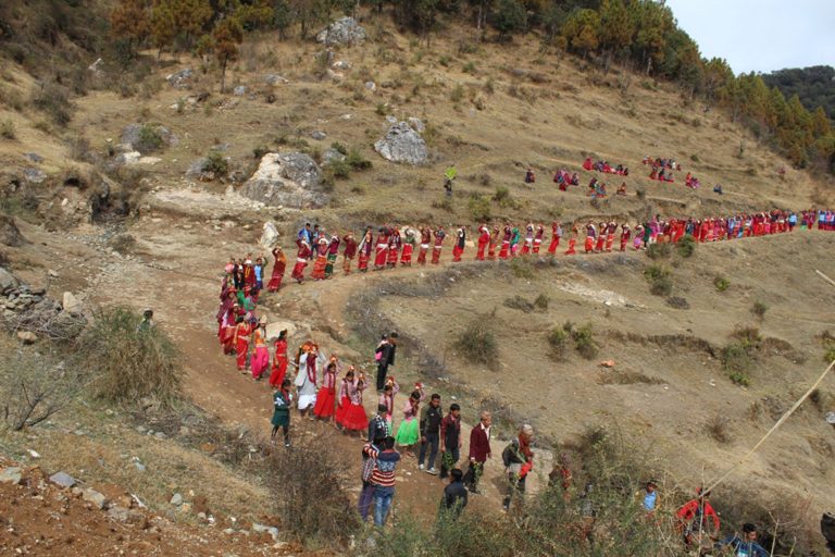 बाजुराको खप्तड छेडेदह गाउँपालिका–७ आटिचौरमा रहेको दशरथ माध्यमिक विद्यालयले आयोजना गरेको बडालेख दशरथ शैक्षिक तथा धार्मिक महेत्सव एवं श्रीमद् भागवत महायज्ञमा गाउँबाट निकालिएका कलशहरु । महायज्ञमा १५ सय कलश निकालिएको आयोजकले जनाएको छ । तस्वीरः प्रेम रौले, बाजुरा