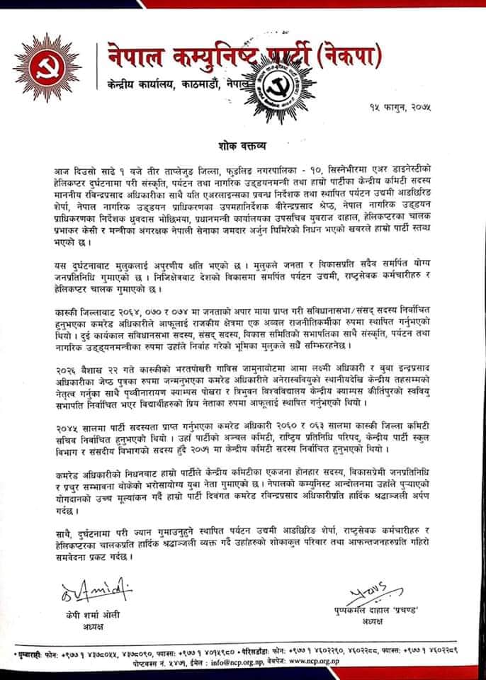 दुर्घटनाबाट मुलुकलाई अपूरणीय क्षति भएको र मुलुकले जनता र विकासप्रति सदैव समर्पितयोग्य जनप्रतिनिधि गुमाउनाका साथै निजी क्षेत्रबाट देशको विकासप्रेमी पर्यटन उद्यमी, राष्ट्रसेवक कर्मचारी र हेलिकप्टर चालकको निधन भएको खबरले पार्टी स्तब्ध भएको अध्यक्षद्वयको वक्तव्यमा उल्लेख छ ।