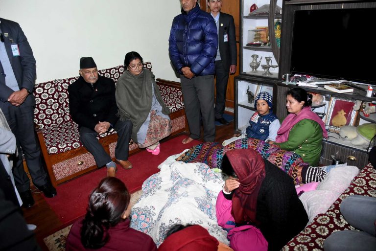 काठमाडौं, १६ फागुन । प्रधानमन्त्री केपी शर्मा ओली, उनकी धर्मपत्नी राधिका शाक्य, मन्त्री तथा नेताहरु ताप्लेजुङ्ग हेलिकप्टर दुर्घट्नामा ज्यान गुमाएका परिवारजनलाई समवेदना दिन बुधबार राति उनीहरुको निवासमा पुगेका थिए ।