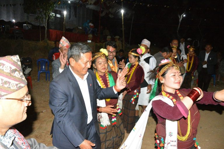 स्थानीयको स्वागत गीतसँगै मुख्यमन्त्री गुरुङ आफैँले खैजडी बजाउन थाल्नुभयो र गीतको तालमा नाच्न पनि । मुख्यमन्त्रीलाई साथ दिँदै आर्थिक मामिला तथा योजनामन्त्री गुरुङ, आन्तरिक मामिला तथा कानुनमन्त्री चुमान र भूमि, व्यवस्था कृषि तथा सहकारीमन्त्री थापासमेत नाच्न अगाडि बढ्नुभयो । मुख्यमन्त्री र मन्त्रीहरुलाई यहाँका स्थानीय युवतीले कौरा गीतमा साथ दिए ।