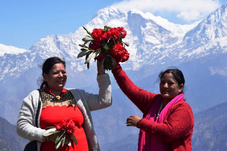 धौलागिरि आईसफल पदमार्गअन्र्तगत ताराखसेमा हिमाललाई पृष्ठभूुमिमा राखेर हातमा गुराँस समातेर तस्वीर लिँदै आन्तरिक पर्यटक । तस्वीरः कमल खत्री, बेनी, म्याग्दी, रासस