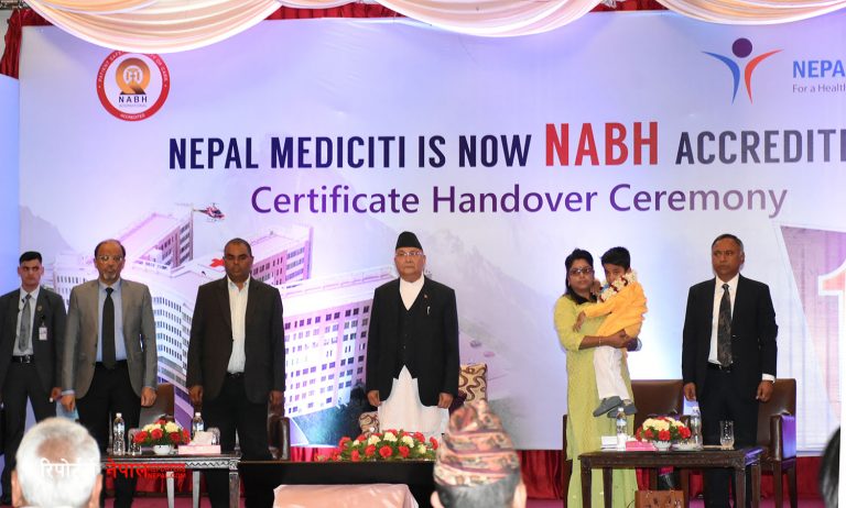 निजी क्षेत्रबाट सञ्चालित नेपाल मेडिसिटी अस्पताल नेपालमा पहिलोपटक नेशनल एक्रिडिटेशन बोर्ड फर हस्पिटल एण्ड हेल्थ केयर प्रोभाइडर्स (एनए विएच) मा सूचीकृत भएको अवसरमा आज आयोजित कार्यक्रममा प्रधानमन्त्री ओलीले भने,खुशी र सुखी हुनका लागि समृद्धि भएरमात्र पुग्दैन, स्वस्थ्य हुनुपर्छ ।