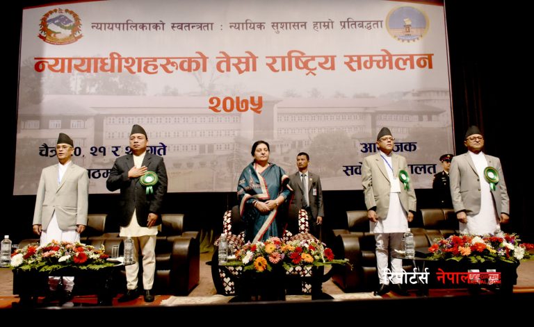 काठमाडौं, २० चैत । राष्टपति विद्यादेवी भण्डारीले न्यायाधीशहरुको तेस्रो राष्ट्रिय सम्मेलनको उद्घाटन गरेकी छिन् । उनले राज्यका विभिन्न अंगलाई विवादमा ल्याउने प्रयास भइरहेको भन्दै असन्तुष्टि पनि जनाईन् । राष्ट्रपति भण्डारीले राज्यका विभिन्न निकायप्रति जनतामा दीग्भ्रमित बनाउने प्रयास भइरहेको बताएकी हुन् ।