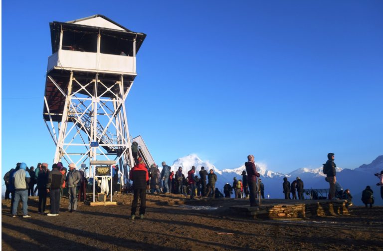 टावरबाट हिमाल अवलोकन गर्दै पर्यटक