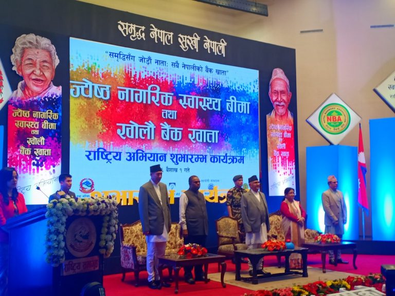 काठमाडौं, १ बैशाख । नयाँ वर्षका अवसरमा आज सरकारले ज्येष्ठ नागरिक स्वास्थ्य बीमा र सबै नेपालीलाई बैँक खाता खोलाउने राष्ट्रिय अभियानको शुभारम्भ गरेको छ । प्रधानमन्त्री केपी शर्मा ओलीले विभिन्न ज्येष्ठ नागरिकको उपस्थितिमा सो ‘ज्येष्ठ नागरिक स्वास्थ्य बीमा तथा समृद्धिसँग जोडौँ नाता, सबै नेपालीको बैँक खाता’ राष्ट्रिय अभियानको शुभारम्भ गरेका हुन् ।