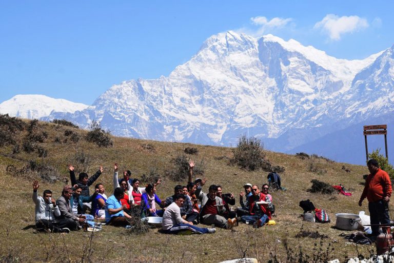 म्याग्दीको रघुगंगा गाउँपालिका–२ मा रहेको पर्यटकिय स्थल रुईसेमा अन्नपूर्ण हिमाललाई पृष्ठभुमिमा राखेर बनभोज खाँदै गरेका आन्तरिक पर्यटक । तस्वीरः कमल खत्री, रासस, बेनी (म्याग्दी ) ।