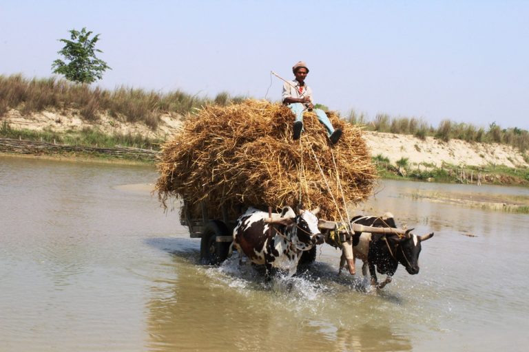 कञ्चनपुर देखतभूलीका किसान गोरु गाडामा गहुँ राखेर वनहरा नदी पार गर्दै । तस्वीर राजेन्द्रप्रसाद पनेरु,कञ्चनपुर