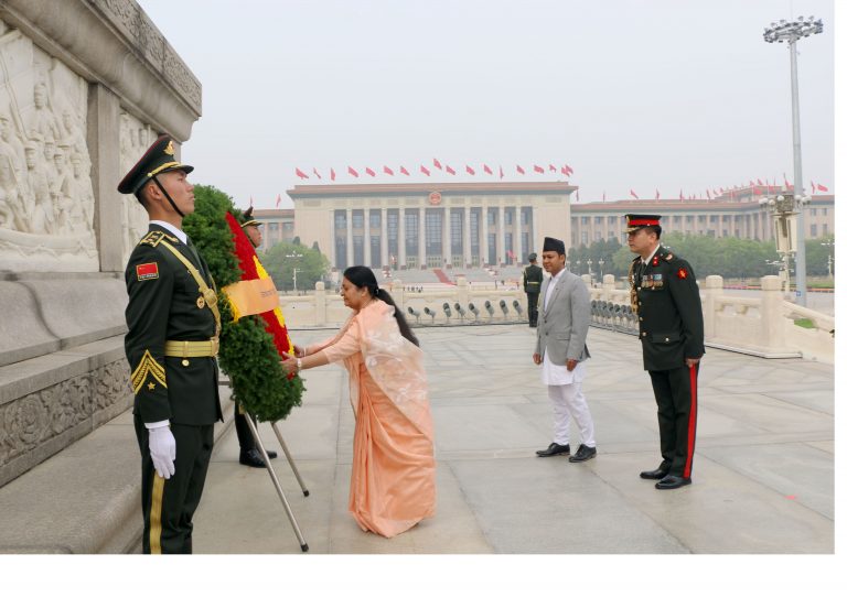 बेइजिङ, १६ वैशाख । राष्ट्रपति विद्यादेवी भण्डारीले आज बिहान बेइजिङको तियानमेन चोकको दक्षिणी भागमा अवस्थित जनताका शहीदको स्मारकमा आज पुष्पहार अर्पण गरी श्रद्धाञ्जलि व्यक्त गर्नुभयो ।स्मारकस्थल पुग्दा उहाँलाई चिनियाँ परराष्ट्र मन्त्रालयका सचिव कोङ सुआनयुले स्वागत गर्नुभएको थियो ।