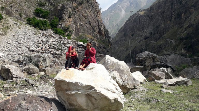डोल्पाको मुड्केचुला गाउँपालिकाको त्रिवेणीमा टेलिफोनको टावरले काम नगर्दा घरबाट सिडिएमए फोन बोकेर नेटवर्कको पहुँच भएको ठाउँमा आई फोन गर्दै स्थानीय महिला । तस्बिरः हेमन्त केसी, जाजरकोट