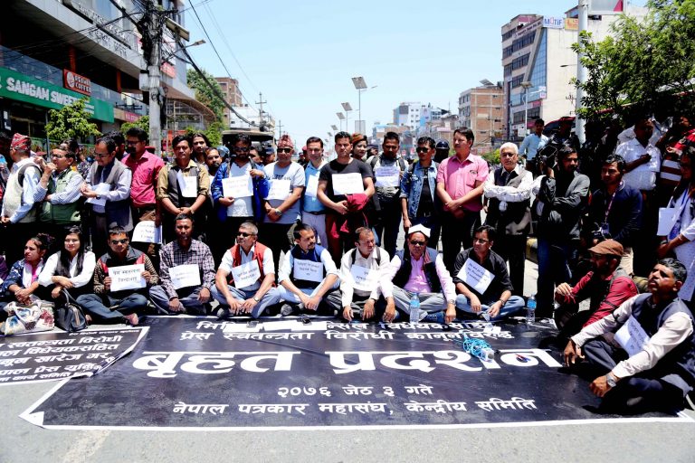 काठमाडौँ, ३ जेठ । सरकारले संसदमा दर्ता गरेको मिडिया काउन्सिल विधेयकविरुद्ध उत्रिएका पत्रकारहरुले शुक्रबार संसद भवन अघि प्रदर्शन गरेका छन्। नेपाल पत्रकार महासंघको आव्हानमा राधजानीका विभिन्न मिडियामा आवद्ध पत्रकाहरुले उक्त विधेयक फिर्ता हुनु पर्ने माग गर्दै प्रदर्शन गरेका हुन्।