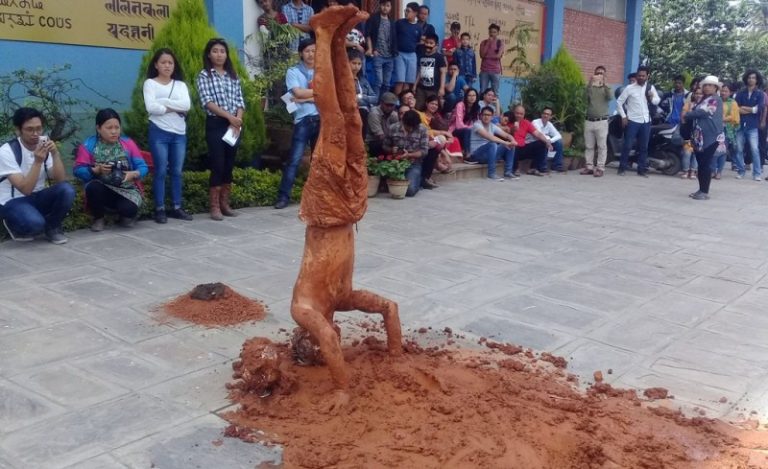 काठमाडौँको नेपाल कला परिषदमा जारी राष्ट्रिय ललितकला प्रदर्शनीअर्न्तगत नयाँ विधा परफरमेन्स ९भावभङ्गी० कला प्रस्तुत गर्दै कलाकार कोशल हमाल । तस्वीरः नारायण ढुङ्गाना
