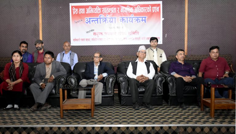 क्रान्तिकारी पत्रकार महासंघ, प्रगतिशील पत्रकार संघ, जनपत्रकार संगठन, नेपाल प्रेस सोसाइटी र मधेसी पत्रकार नेपाल एक ठाउ उभिएका हुन् । शनिवार काठमाडौंमा गरिएको प्रेस तथा अभिब्यक्ति स्वतन्त्रता अधिकारको प्रश्न विषयक अन्र्त्क्रिया कार्यक्रममा उनीहरुले बिधेयकको विरोध गरेका छन् ।