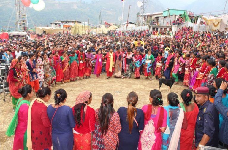 प्रथम बाजुरा महोत्सवको पाँचौ दिन मंगरवार डेउडा गायक लालबहादुर धामी अछामी बड्डोले गाएको गीतमा डेउडा लगाउँदै महिलाहरु । तस्वीरः प्रेम रौले