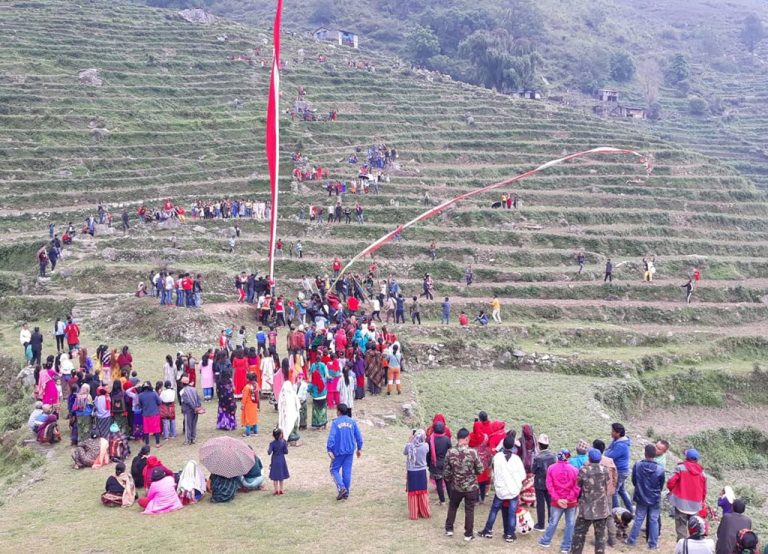 म्याग्दी, रघुगंगा गाउँपालिका ४ दग्नामस्थित भुमे पुजाको अवसरमा आयोजना गरिएको दुई गाउँ विच लिङगो जुधाइ प्रतियोगिता । तस्वीर: धु्रर्बसागर शर्मा