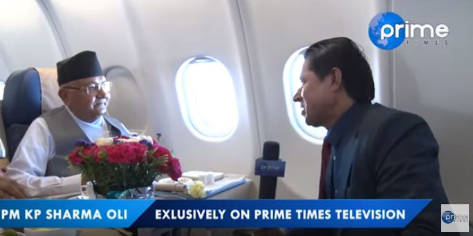 प्रधानमन्त्री केपी शर्मा ओलीले आफू र मोदीबीच नेपाल भारत द्धिपक्षीय सम्बन्धलाई कसरी अझै नयाँ उचाईमा लैजाने भन्ने विषयमा कुराकानी भएको स्पष्ट पारेका छन् । नेपालको विकास र समृद्धिमा भारतको र खासगरी मोदीको पूर्ण साथ र सहयोग रहनेपनि ओलीको विश्वास छ । मोदीको सपथग्रहणमा सहभागी हुन प्रधानमन्त्री ओली भारत पुगेका थिए । दुई दिने भारत भ्रमण सम्पन्न गरि स्वदेश फर्किने क्रममा प्राईम टाईम्स टेलिभिजनको लागि पत्रकार ऋषि धमलालाई आकाशमा जहाज उड्दै गर्दा ओलीले अन्तर्वार्ता दिएका छन् । उनले आफू र नेकपाका अर्का अध्यक्ष पुष्पकमल दाहाल प्रचण्डबीचको सम्बन्धपनि सुमधुर रहेको जिकिर गरे । पत्रकार धमला र ओलीबीचको कुराकानीको सम्पादित अंश :