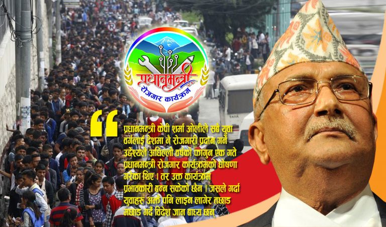 प्रधानमन्त्री केपी शर्मा ओलीले सबै युवा वर्गलाई देशमा नै रोजगारी प्रदान गर्ने उद्देश्यले अघिल्लो वर्षको फागुन एक गते प्रधानमन्त्री रोजगार कार्यक्रमको घोषणा गरेका थिए । तर उक्त कार्यक्रम प्रभावकारी बन्न सकेको छैन । जसले गर्दा युवाहरु अझै पनि लाइन लागेर तछाड मछाड गर्दै विदेश जान बाध्य छन् । कामका लागि नेपाली युवा जाने देशमध्येको सबैभन्दा उत्तम गन्तव्य मानिएको दक्षिण कोरिया जानका लागि युवाहरु संघर्ष गरिरहेका छन् ।