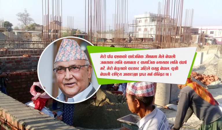 अर्को प्रसंगमा उनले भने, ‘मेरो पाँच दशकको सार्वजनिक जीवनमा मैले नेपाली जनताका लागि समानता र सामाजिक न्यायका लागि सङ्घर्ष गरेँ, मेरो नेतृत्वको सरकार अहिले समृद्ध नेपाल, सुखी नेपाली राष्ट्रिय आकाङ्क्षा प्राप्त गर्न केन्द्रित छ । समृद्धिका लागि हामीलाई दक्ष श्रमिक चाहिन्छ । अब हाम्रो नारा सक्षम श्रमिक, समृद्ध नेपाल, सुखी नेपाली बनाउन चाहन्छौँ ।’