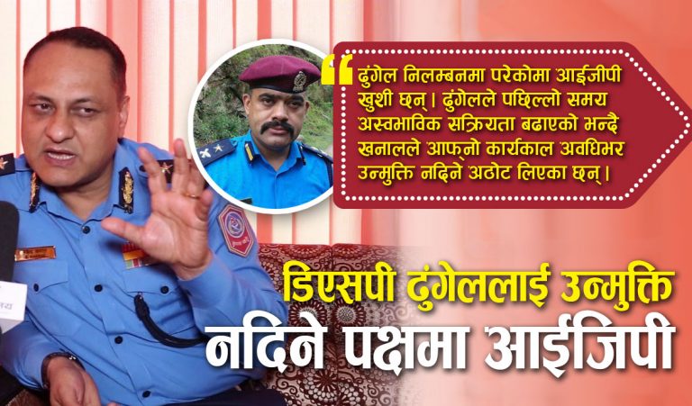 तर, ढुंगेल भने आफूमाथि लागेको निलम्बन फुकुवा गराउनको लागि शक्ति केन्द्र धाउन व्यस्त छन् । प्रहरी प्रधान कार्यालयले झण्डै महिना दिनअघि डिएसपी ढुंगेललाई निलम्बन गरेको थियो । चोरी तथा डकैतीमा संलग्न व्यक्तिहरूसँग नियमित सम्पर्क रहेको भन्दै प्रहरी प्रधान कार्यालयले ढुंगेललाई निलम्बन गरेको हो ।