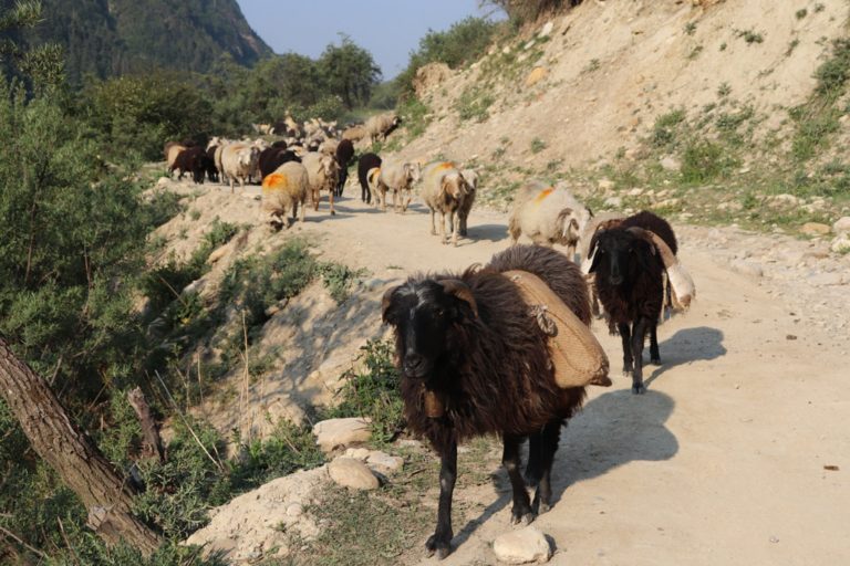 महाकाली नगरपालिका ६ का स्थानीय व्यास गाउँपालिका १ नाम्पा हिमालतिर भारतीय बाटो हूँदै भेडा चराउन लादै । जङगलको अभाव भएपछि स्थानीयले भेडा कम पाल्न थालेका छन् । तस्वीरः नरेन्द्रसिह कार्की दार्चुला