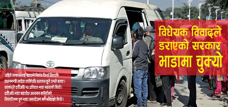 जेठ ३२, काठमाण्डौ । सरकारले सबैखाले सार्वजनीक सवारी साधनमा लागू हुने गरी बढाएको एक दिन पनि नबित्दै फिर्ता लियो । बिहिबार दिउँसो करिब ३ बजेतिर भाडा बढाएको सूचना जारी गरेको यातायात व्यवस्था विभागले बेलुकी ८ नबज्दै विज्ञप्ति जारी गर्दै फिर्ता गरेको हो । यता विभागले भाडा वृद्धि गरेलगतै किन फिर्ता ग¥र्याे भनेर अहिले आम चासोको विषय बनेको छ ।