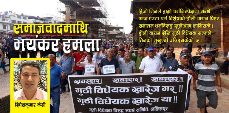 देशलाई संमाजवाद उन्मुख भन्दै संविधान बनाउने कामचाहिं उग्र पूजीवादी ? धर्म र संस्कृतिमाथि ठाडै आक्रमण गर्दा आउने चुनौती बुझेर घुमाउरो ढंगले आक्रमण गर्ने । आधा शताब्दीयता कसैले बोकाएको भारी चल्तापूर्ता नेताहरुले बोकिरहेका छन् । नेपाली समाज भाँड्ने, यहाँको राम्रा संरचना भत्काउने र धर्म संस्कृति नष्ट पार्ने योजना बनाएकाहरुले बोकाएको भारी समयमै बुझ्न जरुरी छ । आज नबुझे भोलि धर्म संस्कृति विनाश पार्ने योजना तिनले पूरा गरिसक्छन् । आज नबोले भोलिसम्म सन्नाटा छाइसक्छ ।
