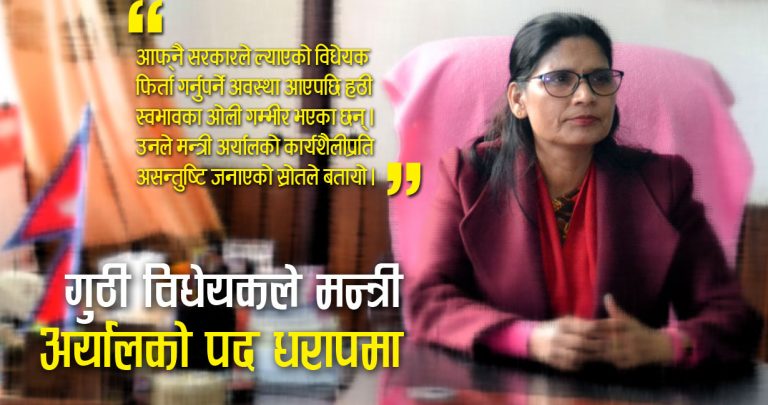 स्रोतका अनुसार अर्यालले गुठी संस्थानले जग्गा जोगाउन नसक्ने जिकिर गरेकी थिइन् । उनले विधेयकको बचाऊ गर्न खोजेकी थिइन् । आफ्नै सरकारले ल्याएको विधेयक फिर्ता गर्नुपर्ने अवस्था आएपछि हठी स्वभावका ओली गम्भीर भएका छन् । उनले मन्त्री अर्यालको कार्यशैलीप्रति असन्तुष्टि जनाएको स्रोतले बतायो ।