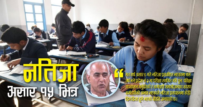 असार महिना सुरु भएसँगै माध्यामिक शिक्षा परीक्षा अर्थात् एसइईको नतिजाको चर्चा सुरु भएको छ । विगतका वर्षमा असार पहिलो साता नै नतिजा सार्वजनिक हुने गरेको थियो । तर यसपटक भने राष्ट्रिय परीक्षा बोर्डले एसइई परीक्षाको परीक्षाफल असार दोस्रो साताभित्र सार्वजनिक गर्ने भएको छ । वोर्डका अध्यक्ष चन्द्रमणि अधिकारीले सबै उत्तरपुस्तिका रुजु गर्ने गर्ने काम भइरहेको बताउँदै असार दोस्रो साताभित्रमा नतिजा प्रकाशन गरिने पुष्टी गरेका हुन् ।