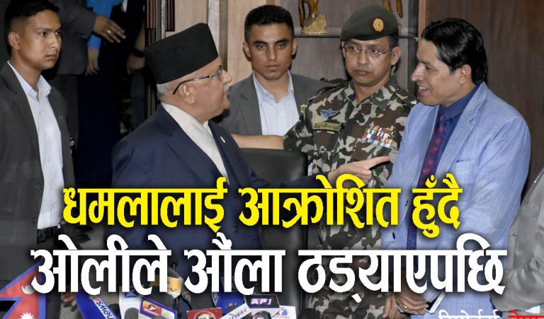 रिपोर्टर्स क्लब नेपालका अध्यक्ष ऋषि धमलालाई प्रधानमन्त्री केपी शर्मा ओलीले औंला ठड्याएका छन् । सिंहदरबारस्थित प्रधानमन्त्री कार्यालयमा आयोजित पत्रकार सम्मेलनपछि ओलीसँग कुराकानी गर्न पुगेका धमलालाई सिधै औंला ठड्याएका हुन् ।  –  बाँकी भिडियोमा हेर्नुहोस्