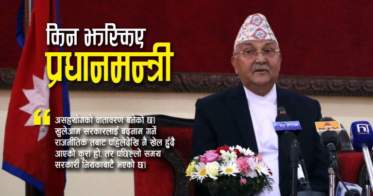 प्रधानमन्त्री ओलीले सरकारी निकाय नै सरकारलाई कमजोर,अलोकप्रिय बनाउनतिर अग्रसर भएको बताए। उनले भने,‘असहयोगको वातावरण बनेको छ। खुलेआम सरकारलाई बदनाम गर्ने राजनीतिक तबाट पहिलेदेखि नै खेल हुँदै आएको कुरा हो, तर पछिल्लो समय सरकारी नियकाबाटै भएको छ। यसमा हामी सजग हुनु जरुरी छ। सजग हुने भनेको कसैले भन्ने ठाउँ नपाउनेगरी काम गर्ने हो। माननीय मन्त्रीहरुले यसमा ध्यान दिनु पर्यो।