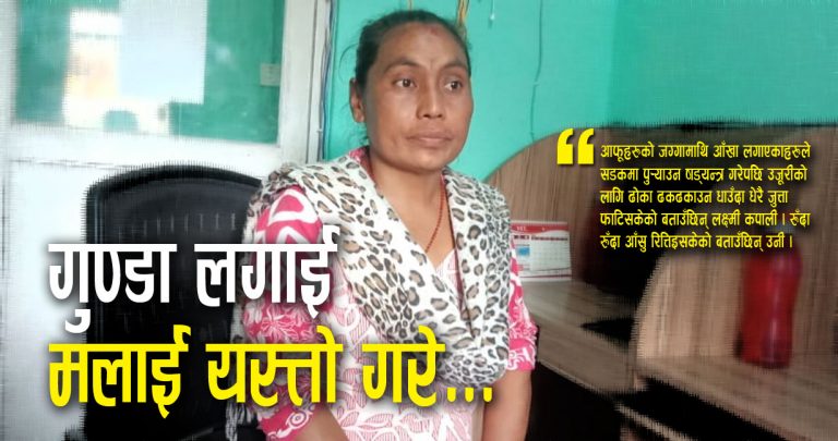 रिपोर्टर्स नेपाल विशेष । ‘अब म कहाँ जाऊ कस्लाई अन्याय सुनाऊँ !’ लक्ष्मी कपालीले रुँदै रिपोर्टस नेपाल डट कमसँग भनिन् । प्रहरी, प्रशासन र अदालतबाट पनि आफूले न्याय नपाएको भन्दै अब सँसारसामु आफ्नो वेदना सुनाउन आएको बताइन् ।