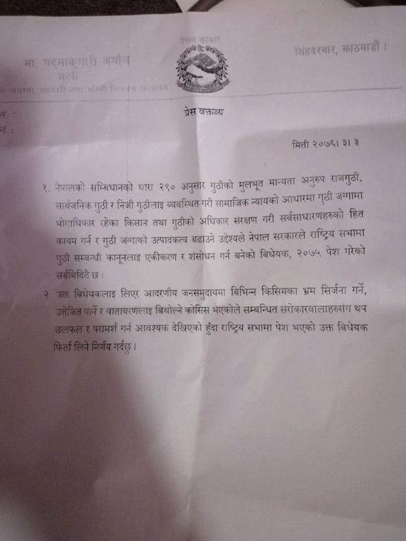 गुठी विधेयक फिर्ता लिन दर्ता भयो पत्र