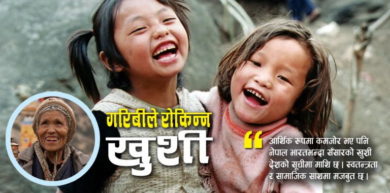 नेपालको भन्दा भारतको वार्षिक कुल ग्राहस्थ उत्पादन एक सय गुणाले बढी छ । तर, भारतभन्दा नेपाल खुशी देशहरुको सूचीमा ४० औं स्थानले माथि छ ।