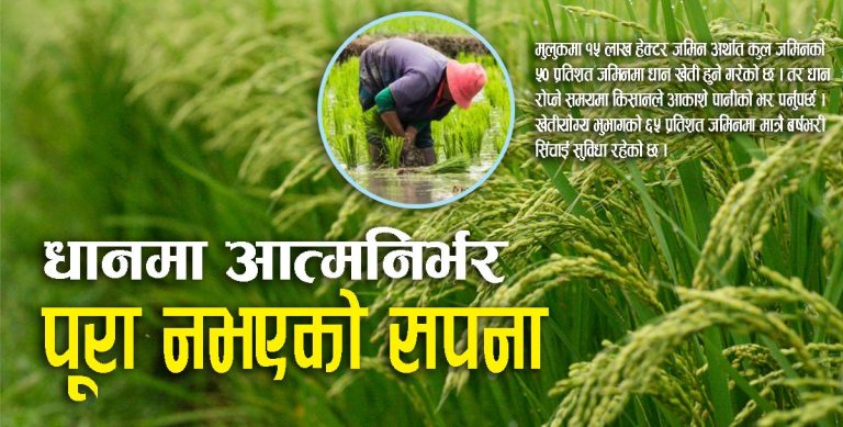 मुलुकमा १५ लाख हेक्टर जमिन अर्थात कुल जमिनको ५० प्रतिशत जमिनमा धान खेती हुने गरेको छ । तर धान रोप्ने समयमा किसानले आकाशे पानीको भर पर्नुपर्छ । खेतीयोग्य भुभागको ६५ प्रतिशत जमिनमा मात्रै बर्षभरी सिंचाई सुविधा रहेको छ ।