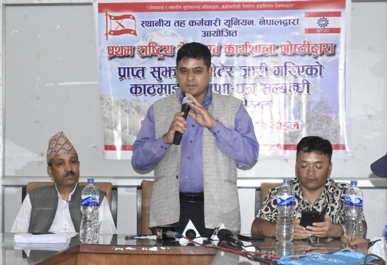 काठमाडौं । १४ बुँदे घोषणापत्र जारी गर्दै स्थानीय तह कर्मचारी युनियनको भेला सम्पन्न भएको छ । यही असार १३ र १४ गते काठमाडौंमा गरिएको प्रथम राष्ट्रिय भेलाको घोषणापत्र तीन तहका सरकारलाई बुझाइने बताइएको छ ।