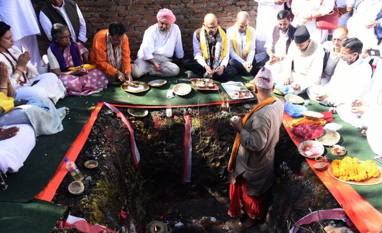 उक्त आश्रम तथा अतिथ गृहको जग शिलन्यास गर्दै भारतीय राजदुत मञ्जिव सिंह पुरीले पतञ्जली सदैव विश्वबन्धुत्वको भावनाले अगाडि बढेको भन्दै पतञ्जली र समाजसेवी श्राफको प्रशंसा गरे । तस्विर : मुकुन्द कालिकोटे, रिपोर्टर्स नेपाल डटकम