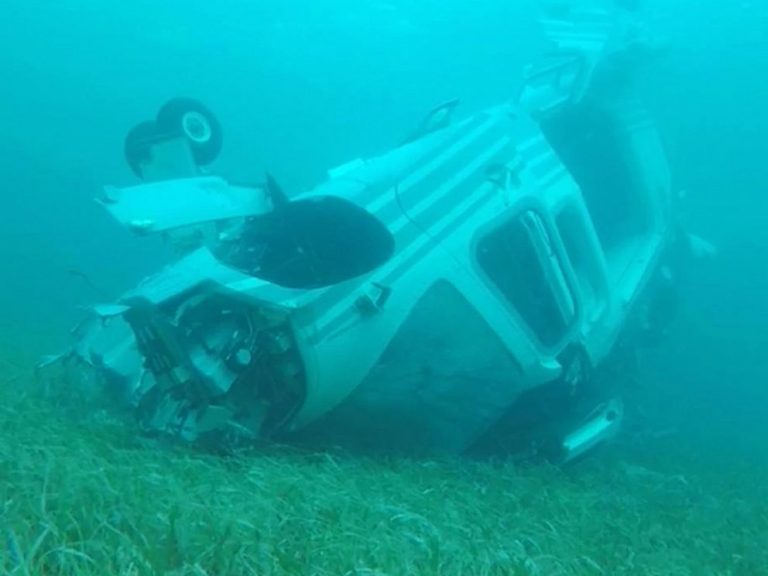 हेलिकोप्टर खसेपछि ग्रान्ड क्लेभन्दा १६ फिट मुनी पानीमा घोप्टिएको अवस्थामा फेला परेको थियो । बहमास प्रहरीले चार महिला र तीन पुरुषको शव भेटिएको पुष्टि गरेको अन्तर्राष्ट्रिय सञ्चारमाध्यमले बताएका छन् । Photo: Abcnews.co.com